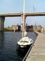 De eerste sluis, de Krammersluis, was een testje om te zien hoe we het met ons tweetjes zouden redden. Ellen was immers helemaal leek als het op zeilen aan komt, laat staan als het over schutten gaat, maar ze deed het alsof ze het al lang gewoon was...